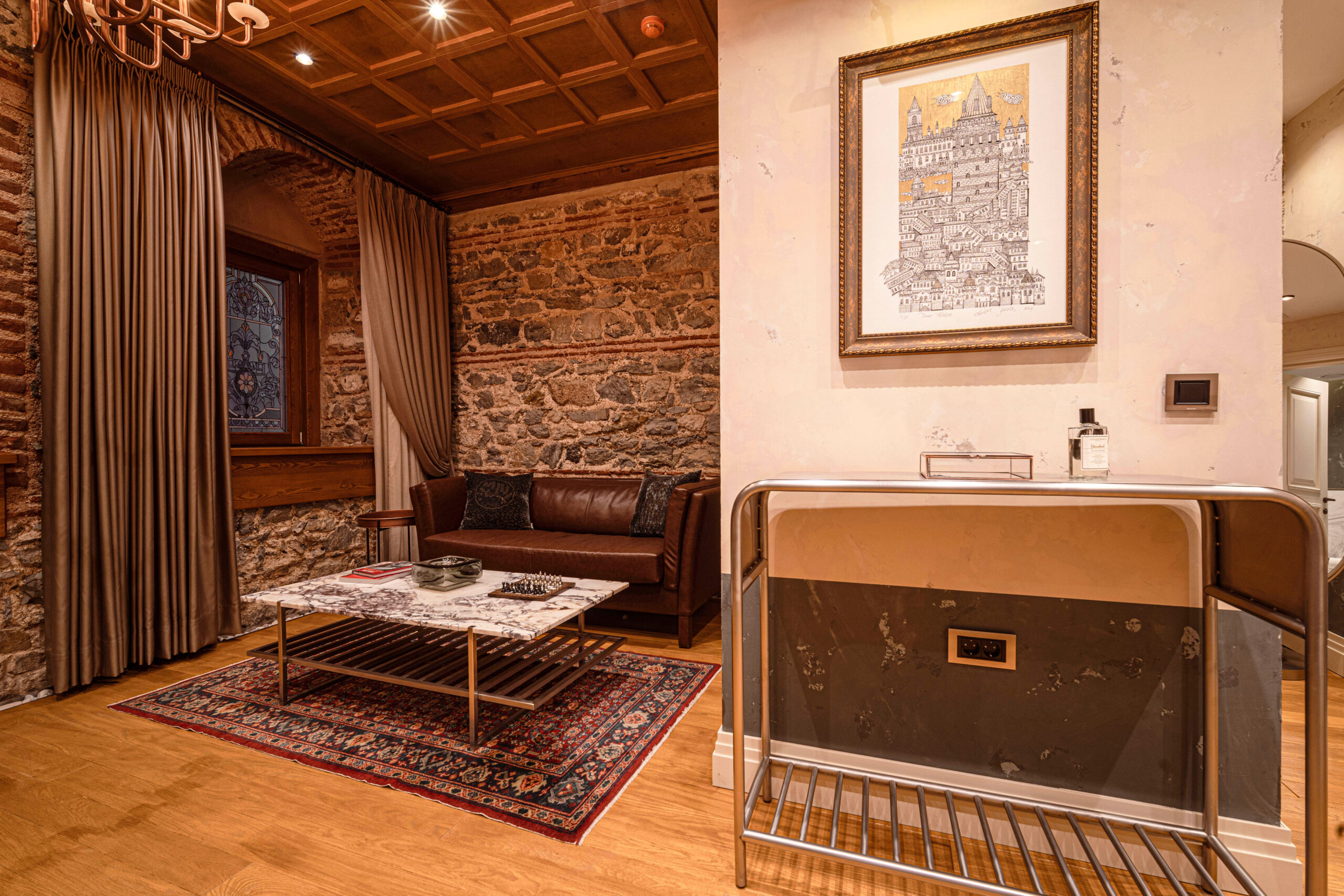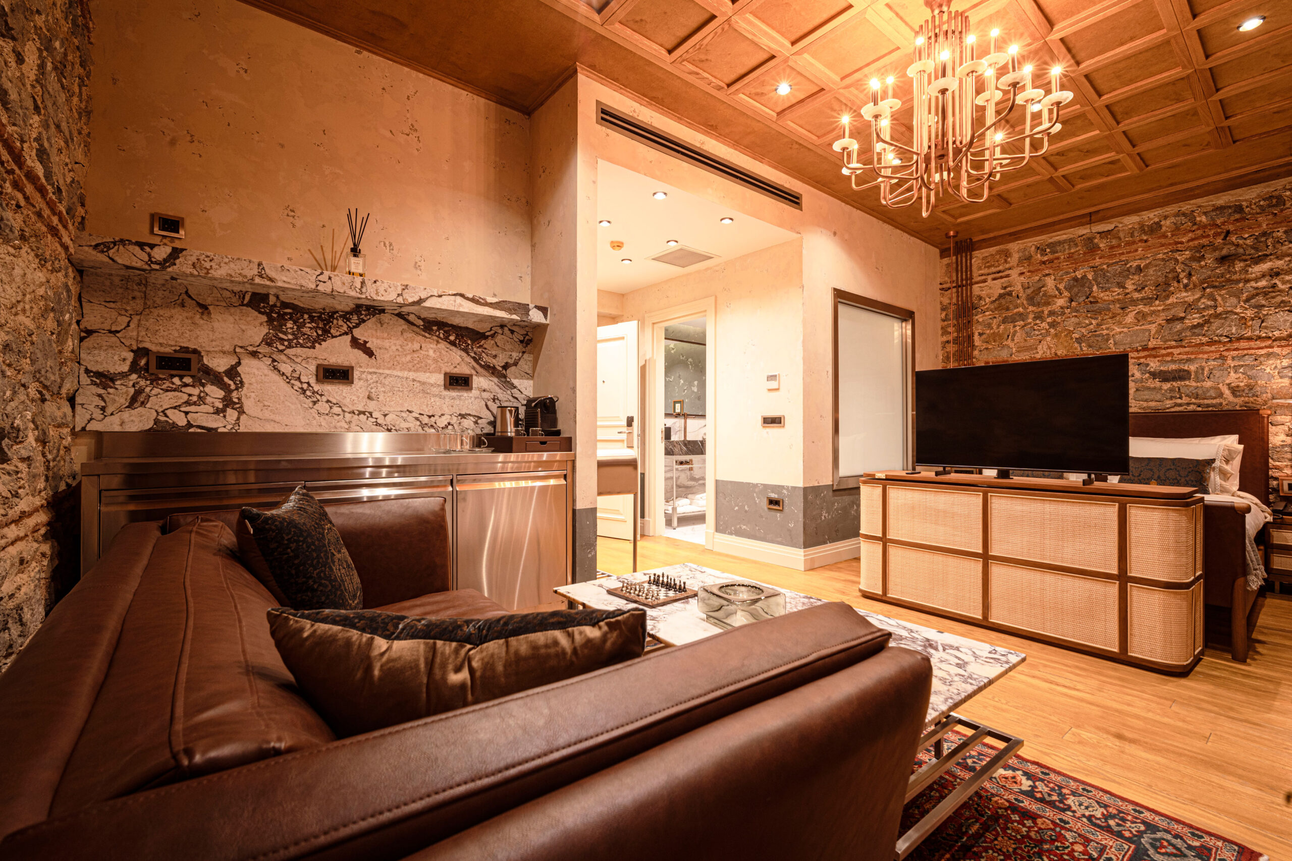 Discover the quiet charm of this rear-facing suite, where stained glass windows filter soft light through the room, and traditional decorative wooden ceilings add depth and character. A spacious lounge area, refined stone accents, and blackout curtains enhance the atmosphere of rest and elegance. The bathroom features copper fixtures and luxury amenities, while the in-room refreshment corner, complete with an espresso machine and kettle, offers a tasteful touch for relaxation. A separate dressing area completes the comfort of this sophisticated space.